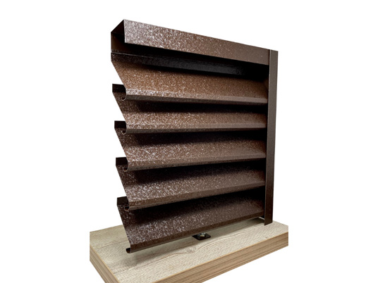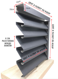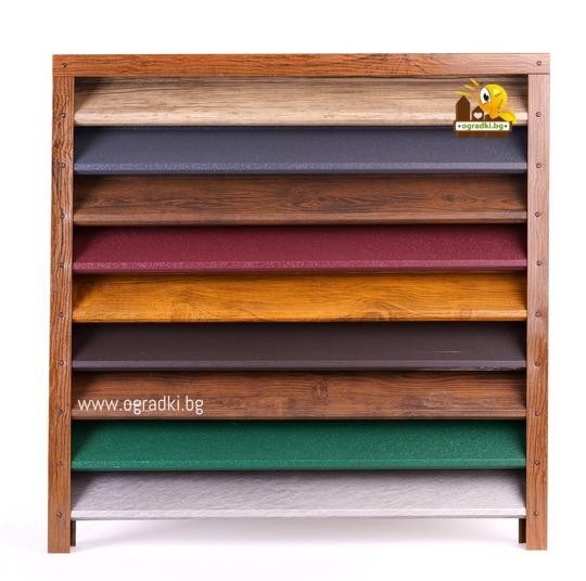 Ламелите за щори за ограда са изработени от поцинкована ламарина, покрити с два слоя грунд. Лицето на ламела е покрито с ПВЦ структурирана боя цвят “Тъмно кафяв РАЛ 8019”, а гърба на ламела е в цвят тъмно кафяв гланц.