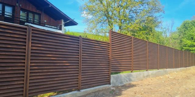 Ламелите за щори за ограда са изработени от поцинкована ламарина, покрити с два слоя грунд. Лицето и гърба на ламела е боядисано с ПВЦ релефна боя, имитация на Махагон.